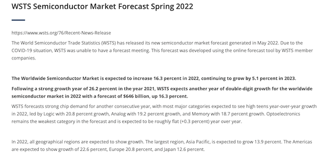 近日,半導體行業(yè)權威機構世界半導體貿易統計協會(WSTS)官網發(fā)布了關于全球半導體市場的最新預測數據。數據顯示,2022年世界半導體市場預計增長16.3%,到2023年將繼續(xù)增長5.1%。